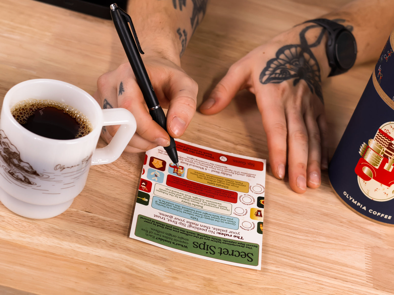 See the festive label on your mystery bag? Tap the matching label below to unlock that coffee's identity — origin, name, and tasting notes. Pro tip: taste it first, be loud with your guesses, then scan the QR for the full story. Scroll on to shop the full bags after you reveal.Partridge in a Coffee Tree