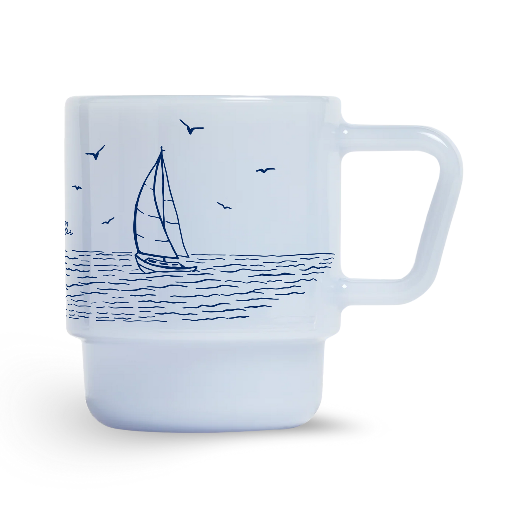 Our "Low Tide" Milk Glass Mugs channel the easy rhythm of the Puget Sound, with hand-drawn seagulls, sailboats, and shoreline scenes on classic milk glass.
